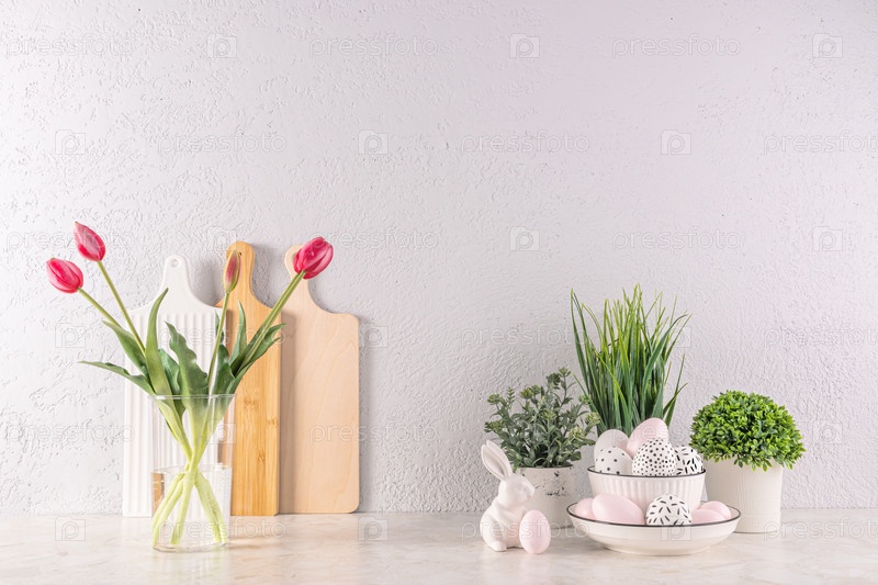 Праздничный кухонный фон на Пасху. Элементы пасхального декора, цветы в вазе и горшках, яйца и кролик на кухонной столешнице