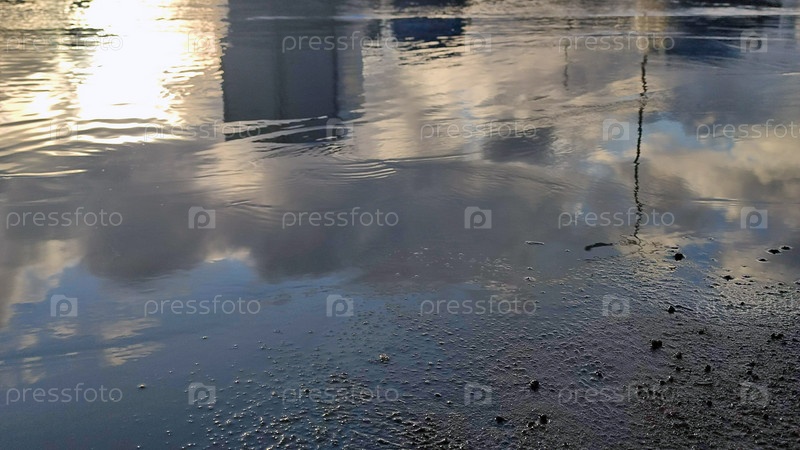 Отражение неба от поверхности лужи. На черном мокром асфальте после осеннего дождя скопилась огромная лужа. Небо и ближайшие машины отражаются от поверхности воды