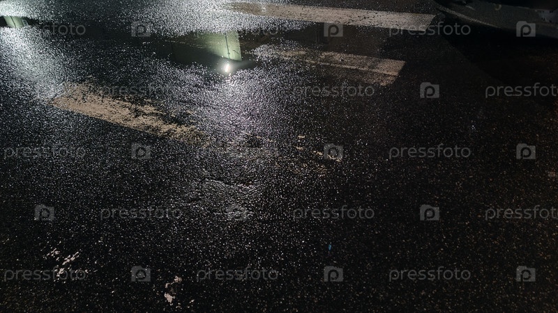 Пешеходный переход поздним вечером. Осенний темный вечер проезжая часть дороги, по которой проходит пешеходный переход. На черном мокром асфальте белые прямоугольные полосы краски