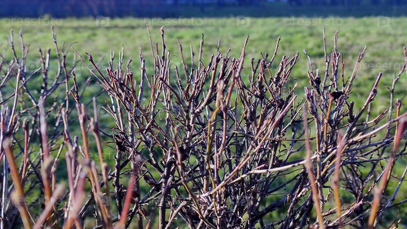 Изогнутые влажные ветки куста. Осенний пасмурный день, широкий растущий куст без листьев с длинными изогнутыми коричневыми ветвями. Замерзшие капли воды висят на ветвях