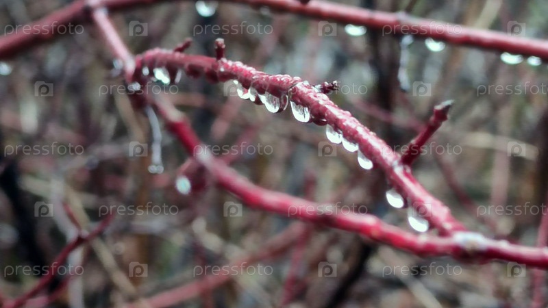 Изогнутые влажные ветки куста. Осенний пасмурный день, широкий растущий куст без листьев с длинными изогнутыми коричневыми ветвями. Замерзшие капли воды висят на ветвях