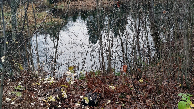 Большая лужа воды на мокром асфальте. Асфальтированная дорога с лужей. Опавшие желтые и коричневые листья деревьев плавают в прозрачной воде. На поверхности воды круги от падающих капель дождя