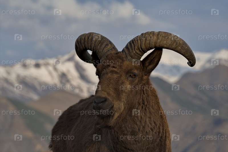 Россия. Северо-Восточный Кавказ.Дагестанский тур с большими изогнутыми руками на фоне заснеженных гор Дагестана