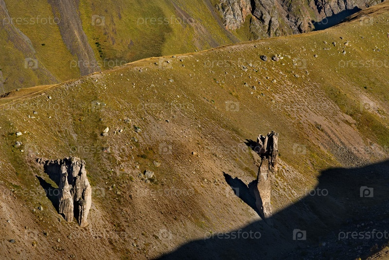 Россия, Северный Кавказ. Вид на удивительные осыпающие пикообразные образования осадочных пород у подножья Эльбруса