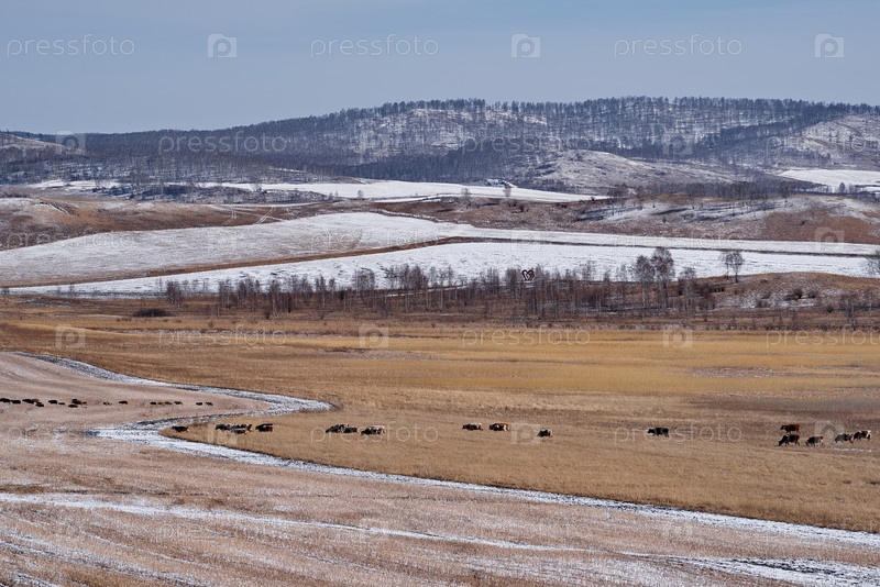 Россия. Красноярский край. Большое стадо породистых коров возвращается домой по заснеженному сельскохозяйственному полю в окружении степных холмов