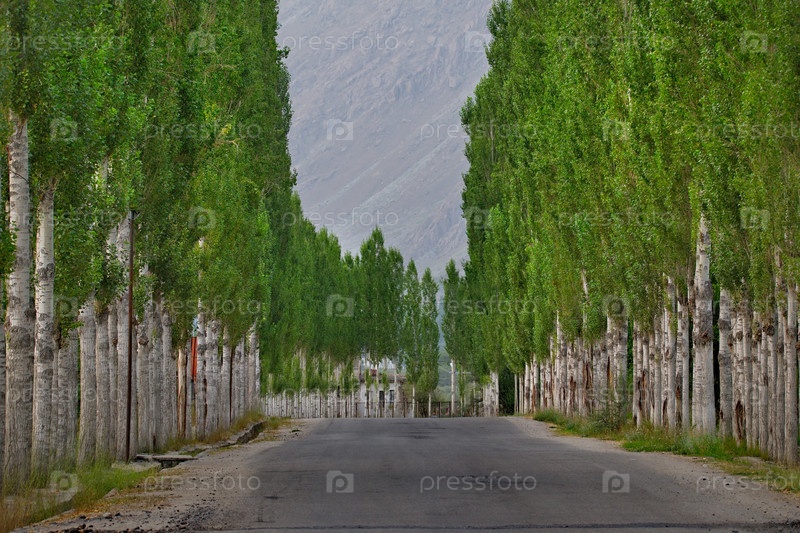 Таджикистан. Вид на аллею из пирамидальных тополей в небольшом поселке на Юге Памирского тракта на границе с Афганистаном