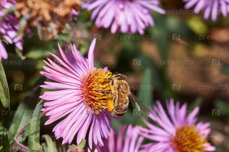 Пчела (лат. anthophila) собирает нектар и пыльцу из цветов многолетней астры
