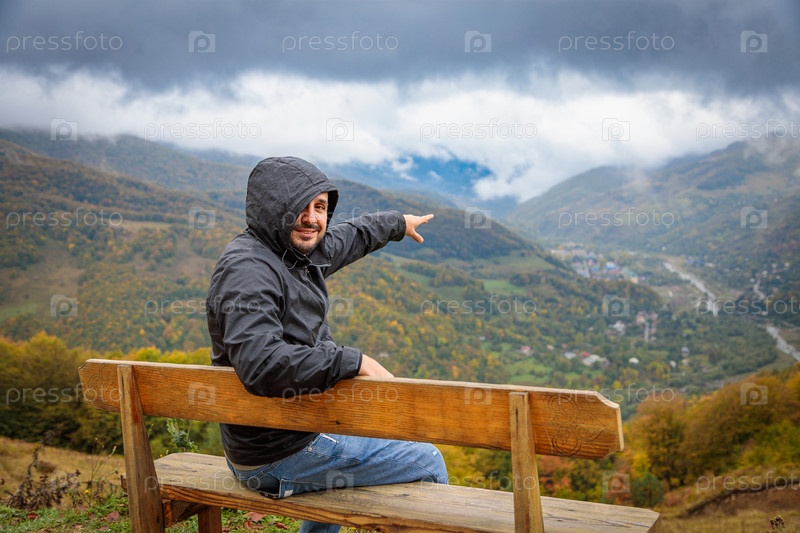 Мужчина наслаждается живописным видом на горы, отдыхая на скамейке смотровой площадки
