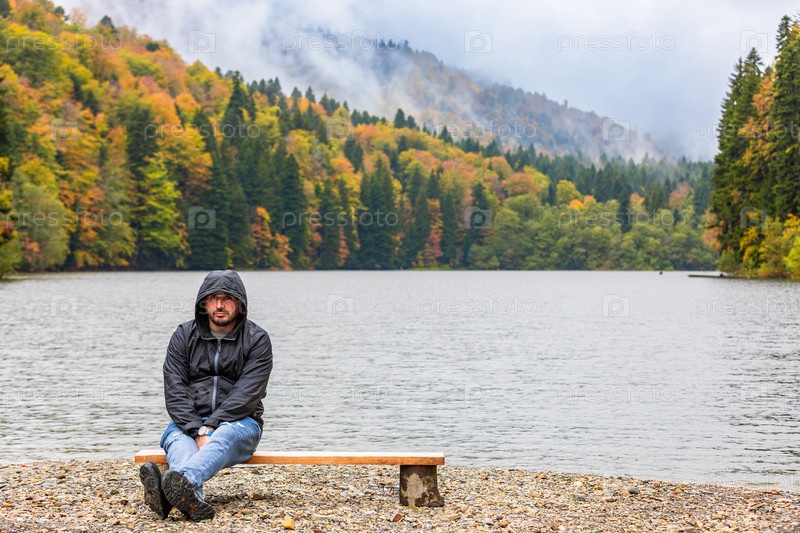 Мужчина любуется живописными пейзажами у озера в горах, наслаждаясь спокойствием и красотой природы
