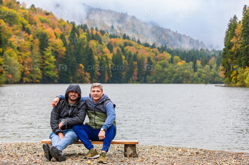 Двое друзей наслаждаются видом на горное озеро, окруженное яркими деревьями