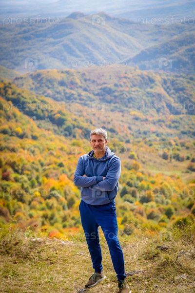Взрослый мужчина стоит на фоне осенних гор
