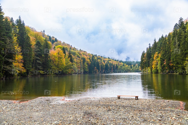 Разноцветные деревья и облака создают яркий контраст со спокойной водой горного озера