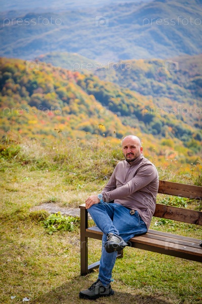 Мирная сцена человека, сидящего на обветренной деревянной скамейке в окружении захватывающей красоты высоких гор и пышной зелени и смотрящего на впечатляющее чудо природы