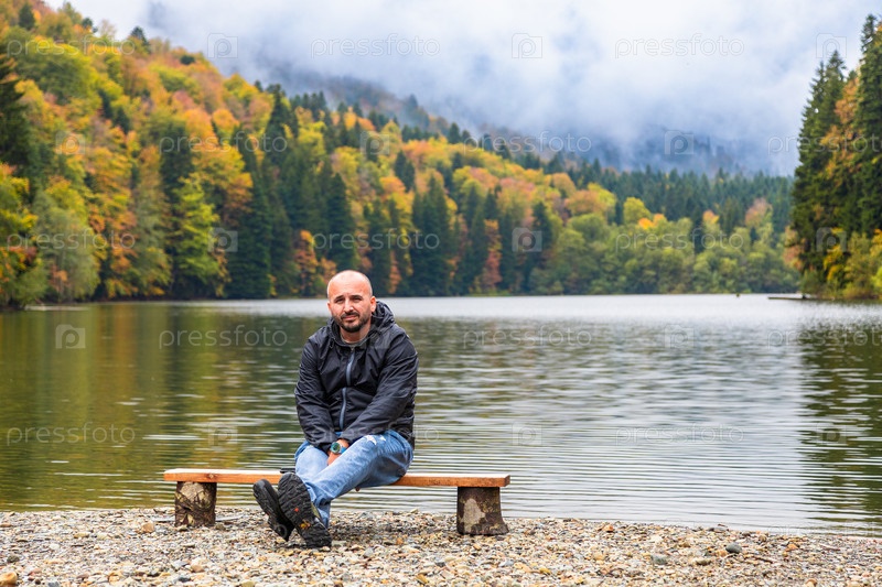 Мужчина на берегу озера в горах