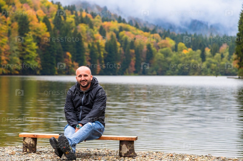Мужчина любуется живописными пейзажами у озера в горах, наслаждаясь спокойствием и красотой природы