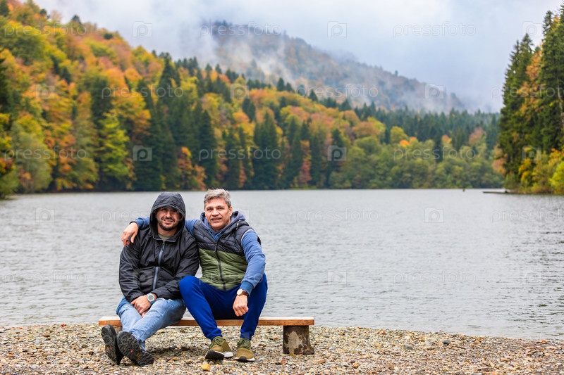 Двое мужчин наслаждаются тишиной и видом на осеннее озеро в горах