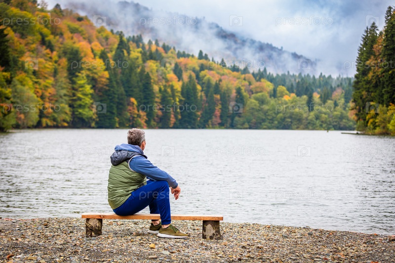 Мужчина в восторге от живописного озера в горах, окруженного прекрасными природными ландшафтами