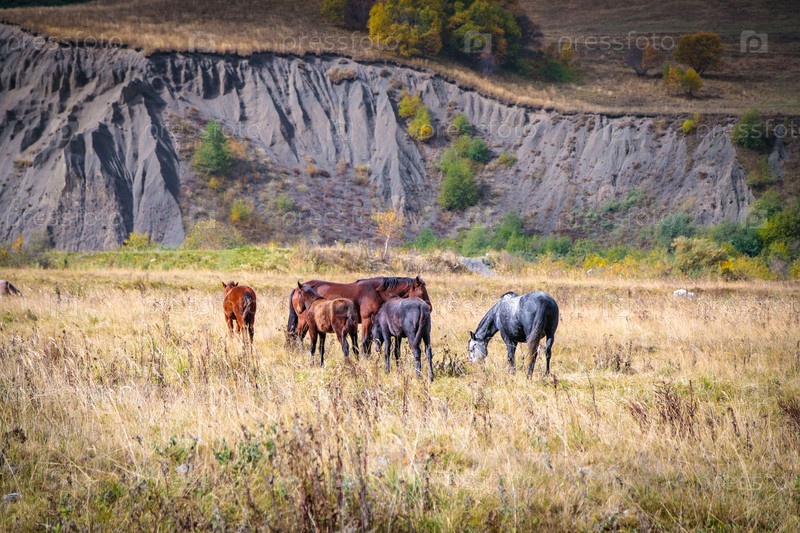 Дикие лошади в естественной среде обитания среди гор, олицетворяющие силу и красоту дикой природы