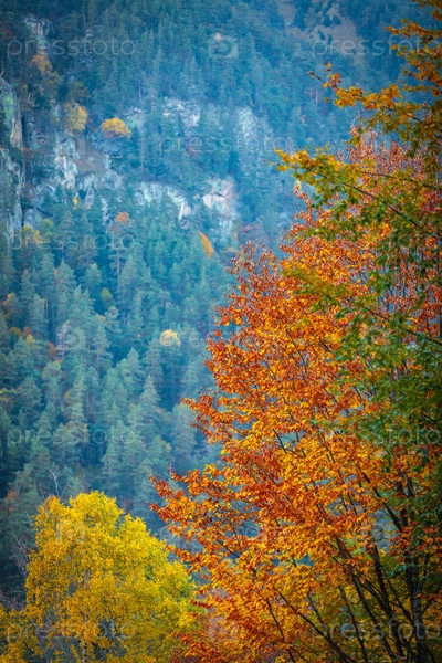 Величественные золотые деревья олицетворяют осеннюю красоту горного ландшафта