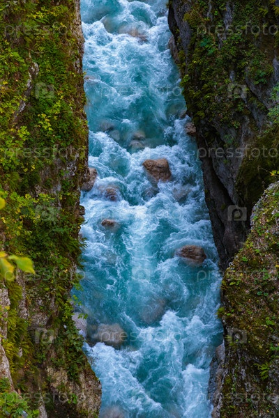 Живописное ущелье с мощным потоком речной воды и горными склонами