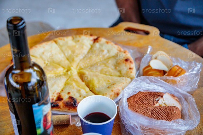 Аппетитный осетинский пирог и бутылка вина на столе с аппетитной едой