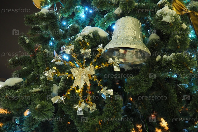 Новогодние украшения на уличной елке. Снежинка, гирлянды, колокольчик и лампочки покачиваются на ветру. Праздничный декор. Самодельные игрушки на ветке елки. Ретро колокол. Зимний вечер