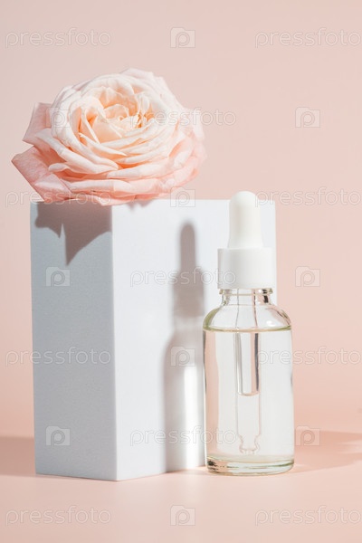 Косметическое масло в белой косметической бутылке-капельнице на белых подиумах на розовом фоне с цветущим цветком розы. Набор для ежедневного ухода за кожей. Мокап для дизайнеров