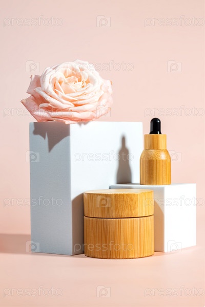 Бамбуковые косметические флаконы с пипеткой и банкой с кремом на белом подиуме, упаковка продукта с цветком розы, антивозрастная сыворотка с пептидами, косметический макет, концепция спа