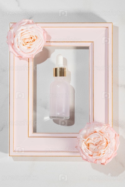 Бутылка сыворотки с капельницей с цветами роз на мраморном фоне. Ароматерапевтическое масло. натуральный косметический продукт для ухода за кожей или телом. Дерматология и косметология