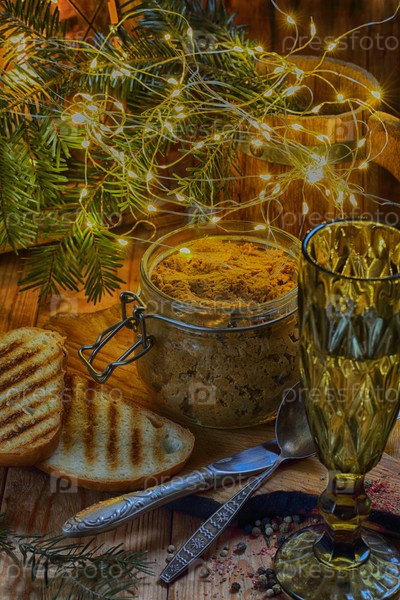 Паштет в стеклянной банке с вином на деревянном фоне