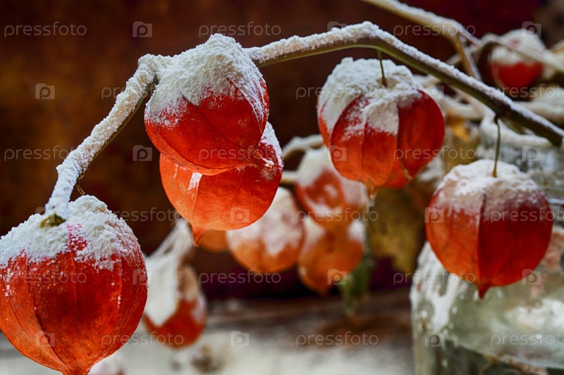 Натюрморт с заснеженным физалисом на деревянном фоне
