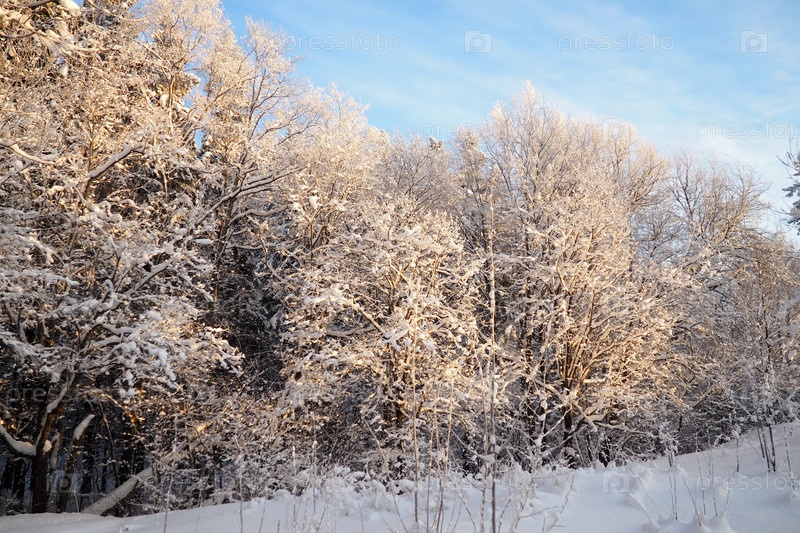 Смешанный тайга зимой в ясную морозную погоду после сильного снегопада. Температура воздуха – 27 градусов по Цельсию. Флора Карелии. Прогулка по ледяному замерзшему лесу. Ветви дерева. Полярный климат