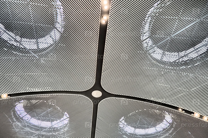 Потолок аэропорта Стамбула с закругленными абстрактными лампами, изысканная элегантность. Современный модный дизайн больших зданий, холлов, создающий ощущение простора и воздуха. Серо-белые тарелки