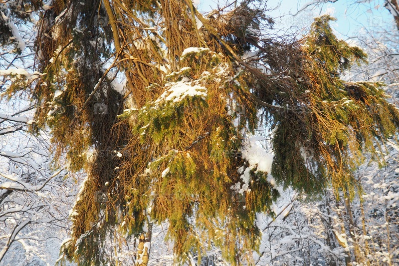 El Picea сосновая вечнозеленая древесина из семейства Сосовых. Вечнозеленые деревья. Обычная ёлка, или обыкновенная ёлка Picea abies, широко распространена в Северной Европе. Снежная зима хвойный лес