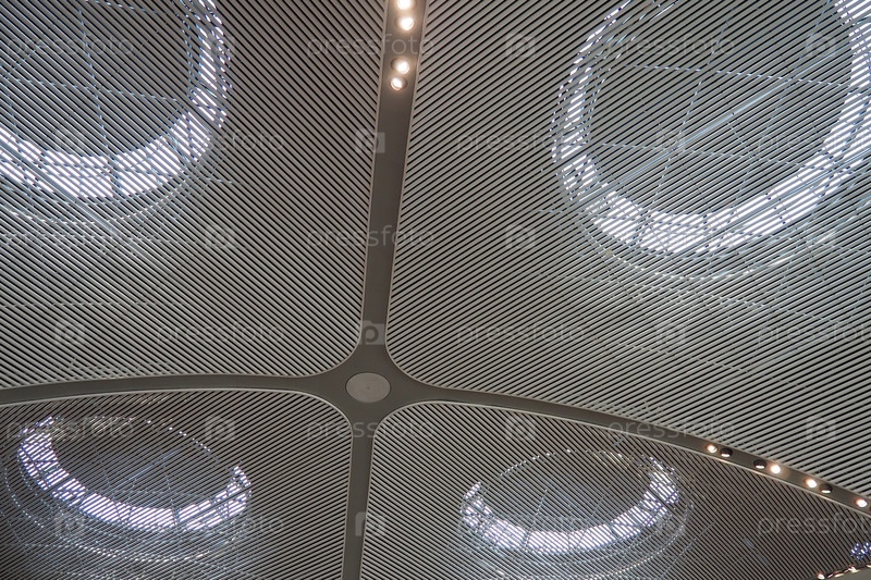 Потолок аэропорта Стамбула с закругленными абстрактными лампами, изысканная элегантность. Современный модный дизайн больших зданий, холлов, создающий ощущение простора и воздуха. Серо-белые тарелки