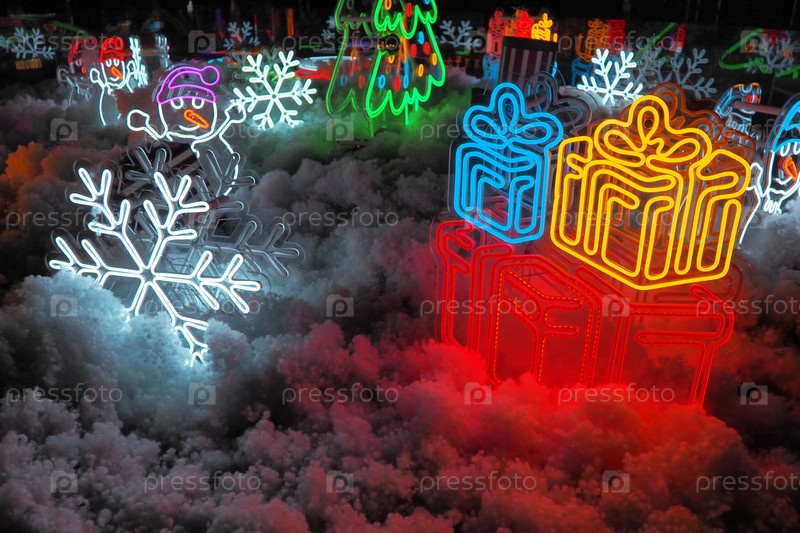 Новогодние и рождественские украшения, гирлянды, малые архитектурные формы. Разноцветные лампочки создают праздничную атмосферу. Снежинка