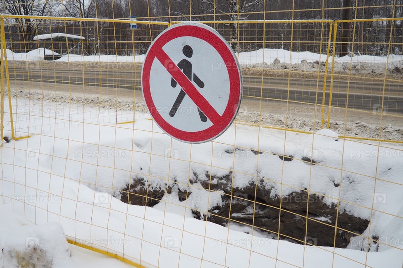 Знак прохода нет, не проходите. Человек перечеркнут красной линией. Круглый запрещающий дорожный знак. Запрещенный. Яма, вырытая в земле, огороженная металлическим забором. Зима, снег и сугробы возле дороги