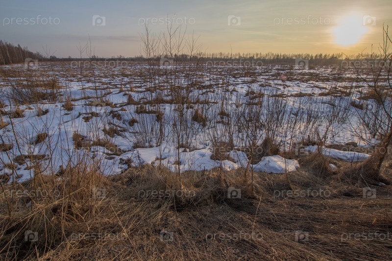 Таяние снега в поле на закате