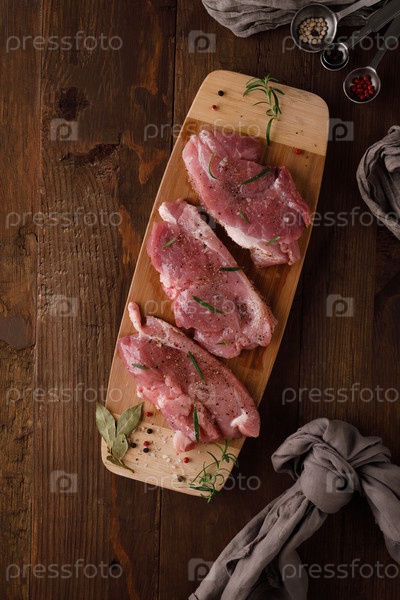 Кусок свежей сырой свинины со специями на коричневом деревянном столе. Мясо со специями. Вид сверху