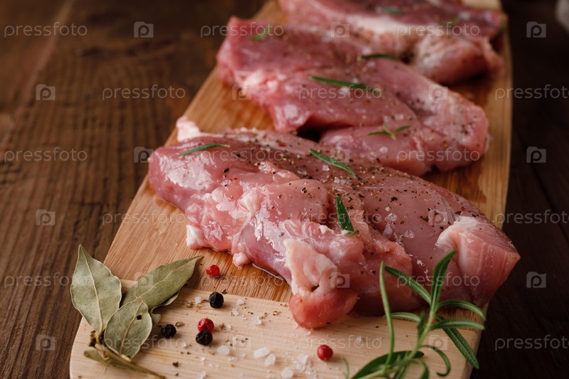 Кусок свежей сырой свинины со специями на коричневом деревянном столе. Мясо со специями