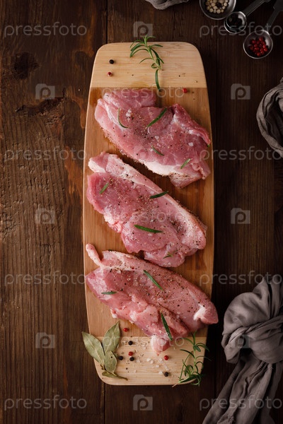 Кусок свежей сырой свинины со специями на коричневом деревянном столе. Мясо со специями. Вид сверху