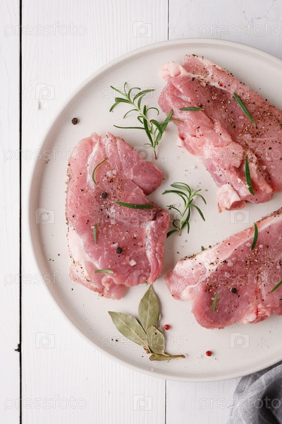 Кусок свежего сырого мяса свинины со специями на белом деревянном столе. Мясо со специями. Вид сверху