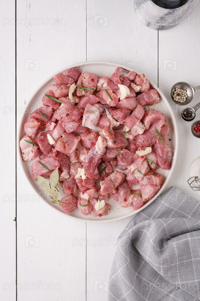 Кусок свежего сырого мяса свинины со специями на белом деревянном столе. Мясо со специями. Вид сверху
