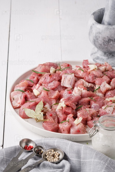 Кусок свежего сырого мяса свинины со специями на белом деревянном столе. Мясо со специями