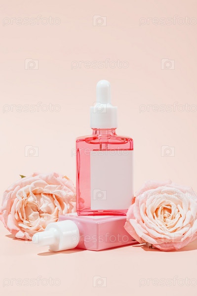 Концепция натуральной органической косметики. Розовая стеклянная бутылка косметического продукта на персиковом фоне с цветущими розами и копировальным пространством. Макет продукта. закрыть