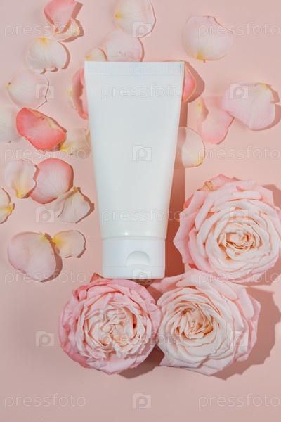Увлажняющий крем для рук, белый пластиковый тюбик, макет на розовом модном фоне с цветами роз. Пустая упаковка косметических средств по уходу за кожей