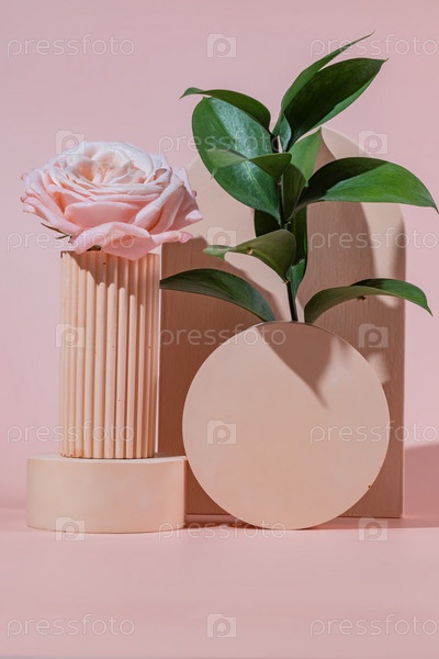 Минимальный косметический фон для презентации продукта. Бетонный подиум на розовом фоне. Концепция естественного ухода за кожей с цветком розы и рускусом