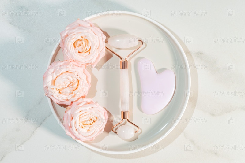 Роллер для лица из розового кварца для ухода за кожей лица. Антивозрастной и тонизирующий эффект. Массаж камнем. Модная презентация косметического инструмента на мраморном фоне