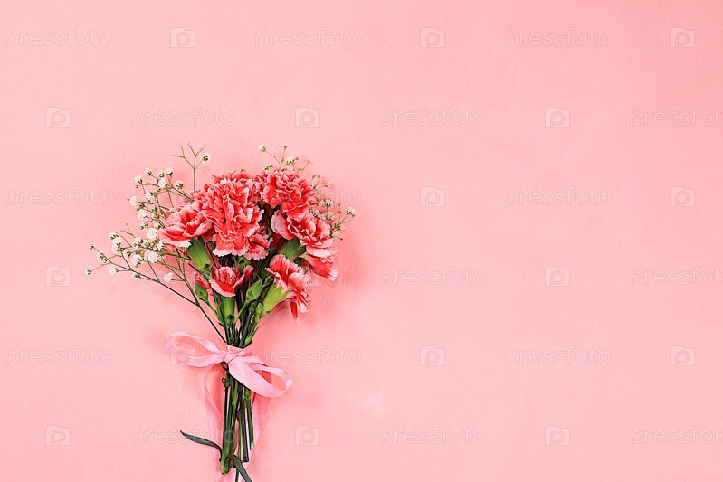 Цветочная композиция с гвоздиками на розовом фоне. Концепция ко Дню святого Валентина или Женскому дню, Дню матери, баннеру, поздравлению любимого человека с праздником, днем рождения,