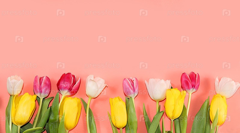 Цветочная композиция с тюльпанами на розовом фоне. Минимальный шаблон для дизайна Концепция Дня святого Валентина или Женского дня, Дня матери, баннера, поздравления любимому человеку с праздником,